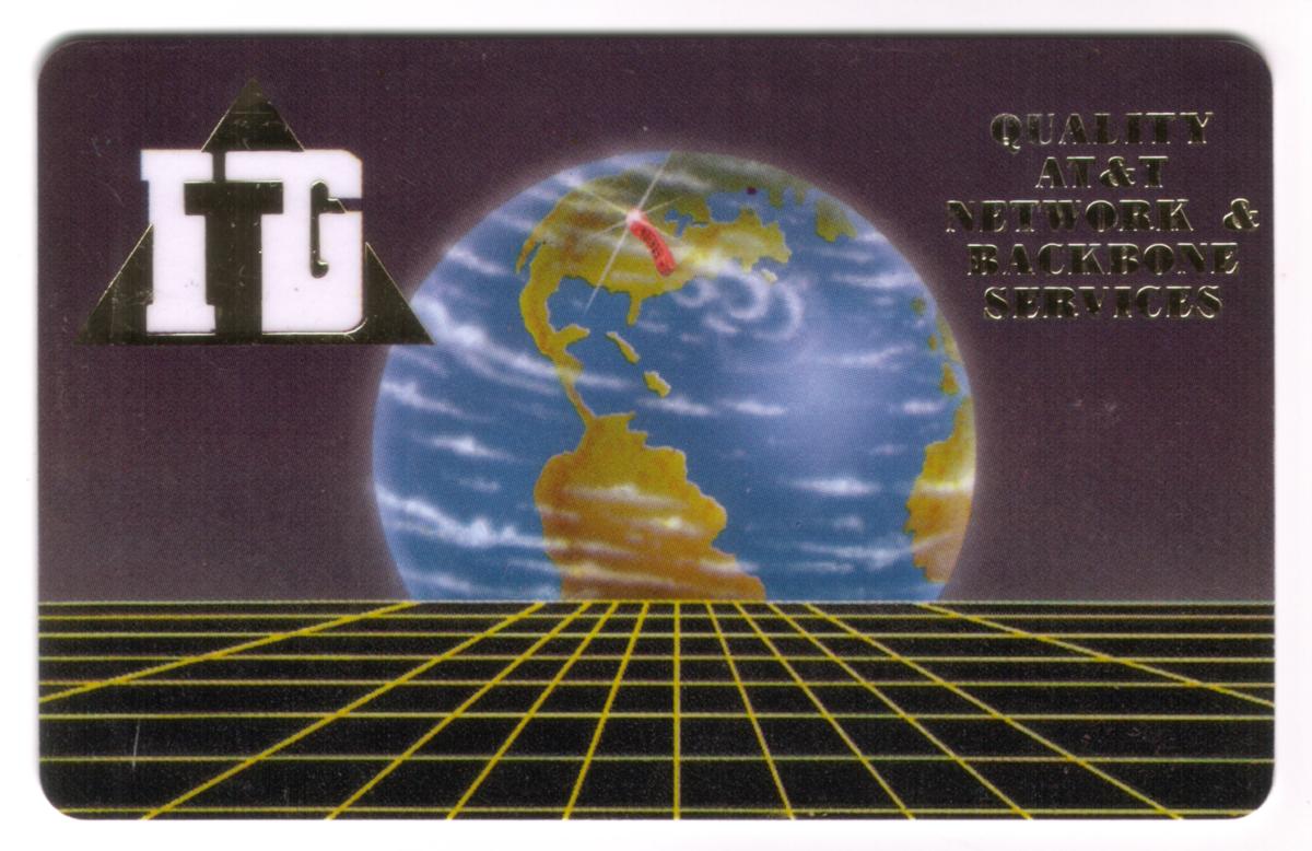 Overall, the card combines branding elements from ITG and AT&T with a global theme centered on the Earth, suitable for international telecommunications. The artwork and text are clear, bold, and aligned with the card’s function as a prepaid calling card distributed for promotional purposes.