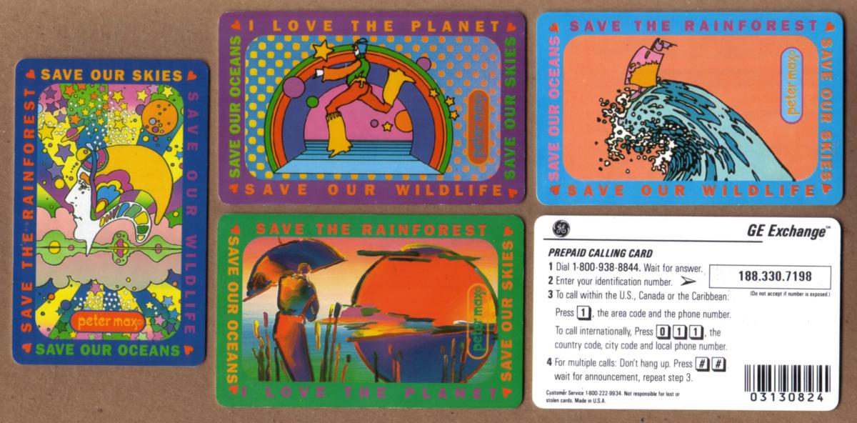 This collectible phone card features artwork by Peter Max from the "Save the Environment" set of four cards, produced for GE Exchange. The card displays vibrant pop art style imagery emphasizing environmental themes. Prominent elements in the design include a colorful depiction of the sun, a rainbow, and ocean waves, all rendered in bold, vivid colors typical of Peter Max’s artistic style.