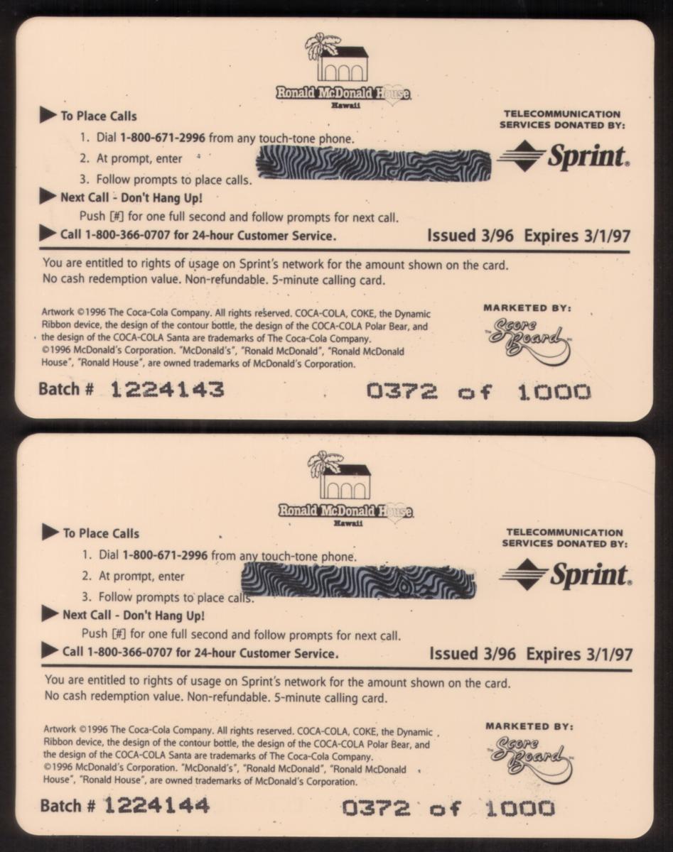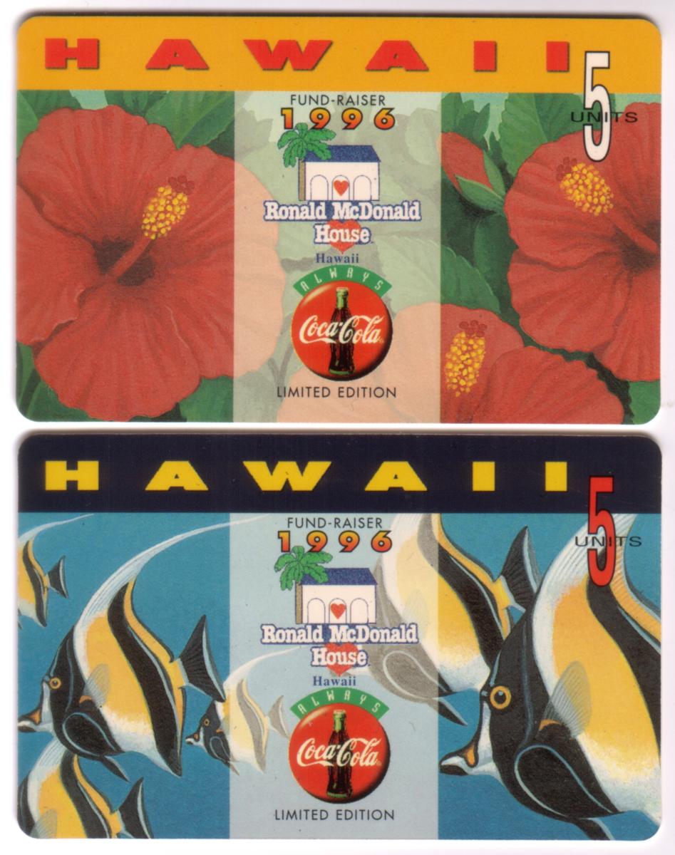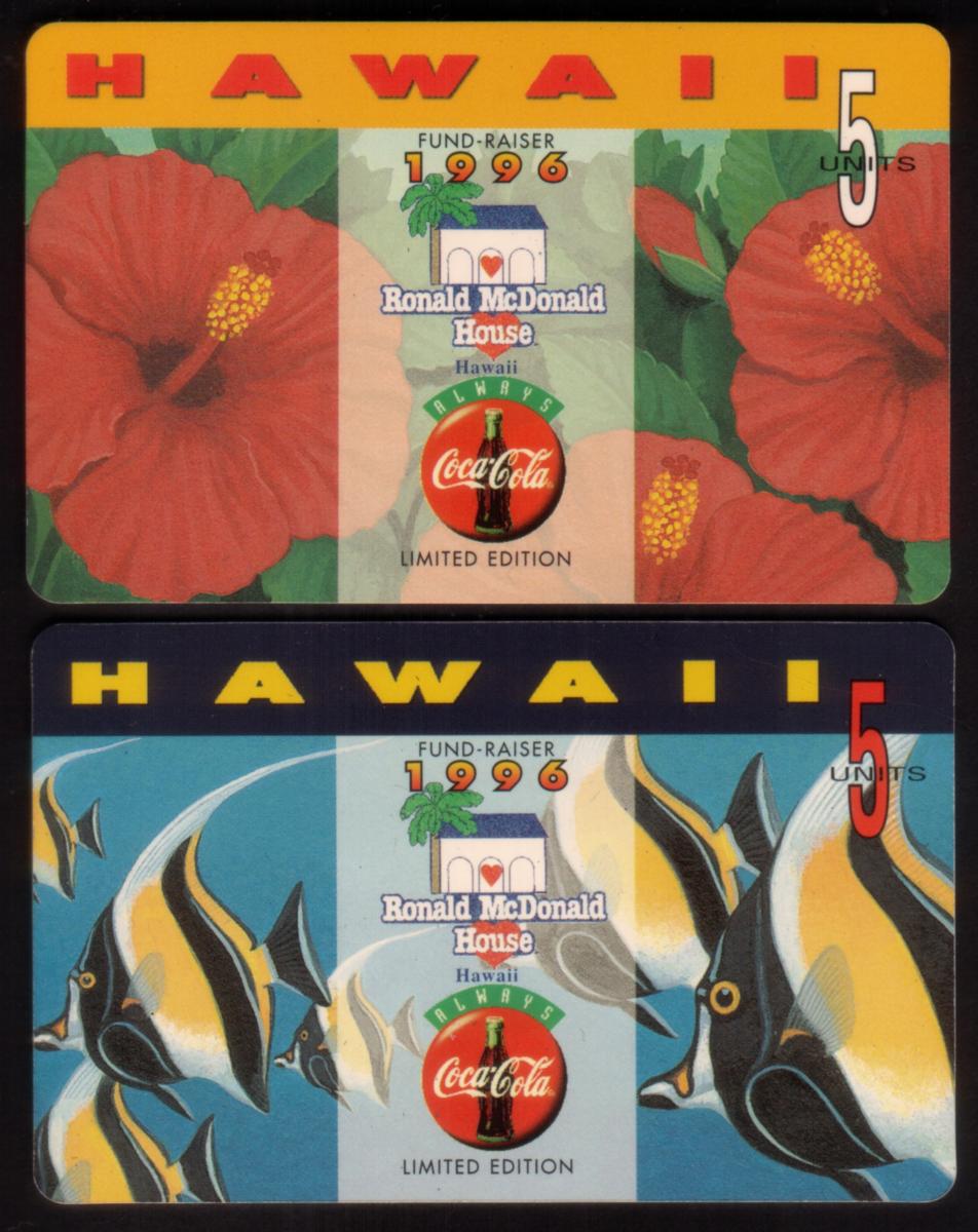 This collectible charitable phone card focuses on the partnership between McDonald’s and Coca-Cola in support of Ronald McDonald House’s Hawaii chapter. The detailed imagery and logos emphasize this collaboration within the context of Hawaiian culture and marine life, combined with corporate branding from two well-known companies.