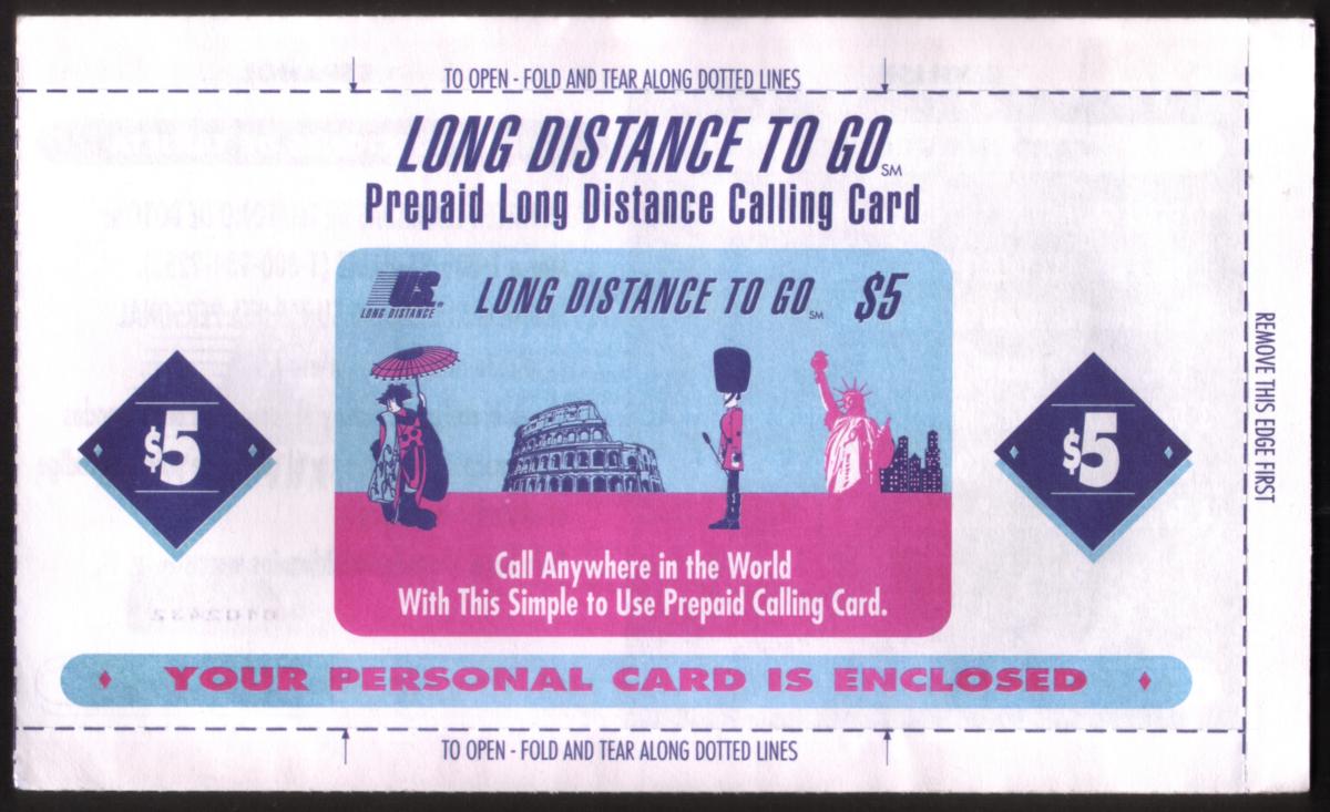The card is denominated at $5 and is branded under "Long Distance To Go," indicating it is a prepaid calling card meant for use with long distance calls. Bold text at the bottom reads: "Call Anywhere in the World With This Simple to Use Prepaid Calling Card." The overall background blends a light blue upper half with a magenta lower half, providing a vibrant contrast to the figures and landmarks featured.