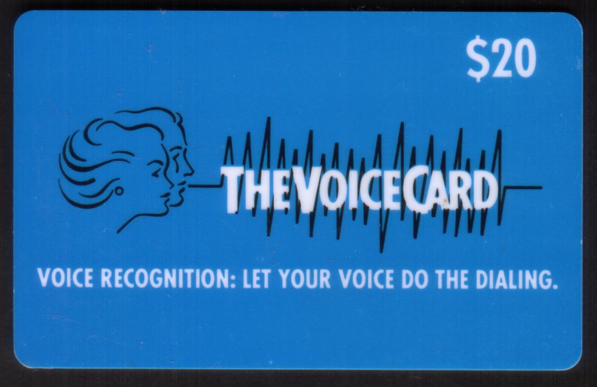 In the upper right corner, the denomination "$20" is printed in white, indicating the card's value or credit amount. The card includes the branding "HOMISCO/Voicenet," connecting it to the technology and telecommunications sector. This specimen card serves as a promotional item highlighting voice recognition technology for telephone dialing.