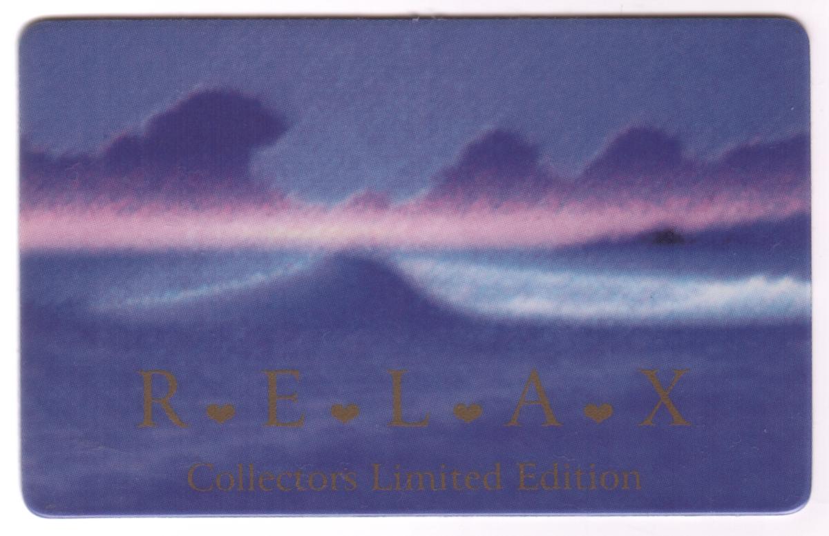 The collectible card features the word "R E L A X" printed in gold lettering at the bottom center. Below this, in smaller gold text, it reads "Collectors Limited Edition." The background is a tranquil landscape rendered in shades of purple and blue, depicting a serene mountain range under a cloudy sky. The scene evokes a calm and peaceful atmosphere, consistent with the theme suggested by the text.