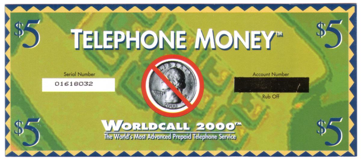 The card’s overall design mimics the look of United States paper currency while clearly identifying itself as a prepaid telephone service card issued by WorldCall 2000. The color scheme and graphical elements emphasize the $5 calling credit value.