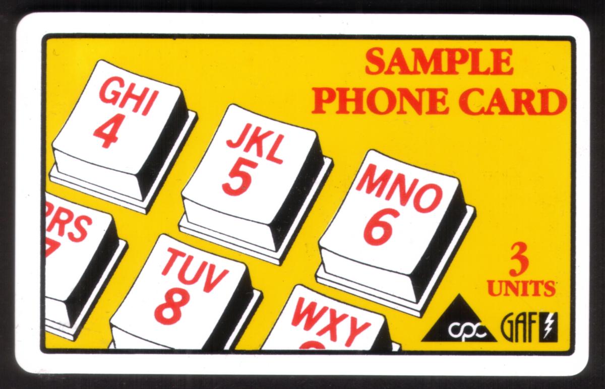 Overall, this collectible phone card emphasizes its telephony function through the depiction of the keypad and the inclusion of telecommunications company names and logos. It displays clear branding related to MCI and GAF Telecom within the WorldCom group. The card is a 3-unit yellow sample, making it a notable piece for collectors interested in telecommunication history and phone card memorabilia.