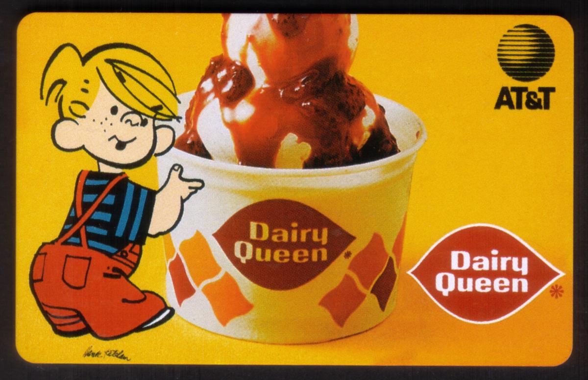 This phone card is a promotional piece linked to the Dairy Queen ice cream brand and the Dennis the Menace character, issued by AT&T. It reflects artistic and cartoon styling, suitable for collectors interested in branded phone cards featuring popular food and comic culture.