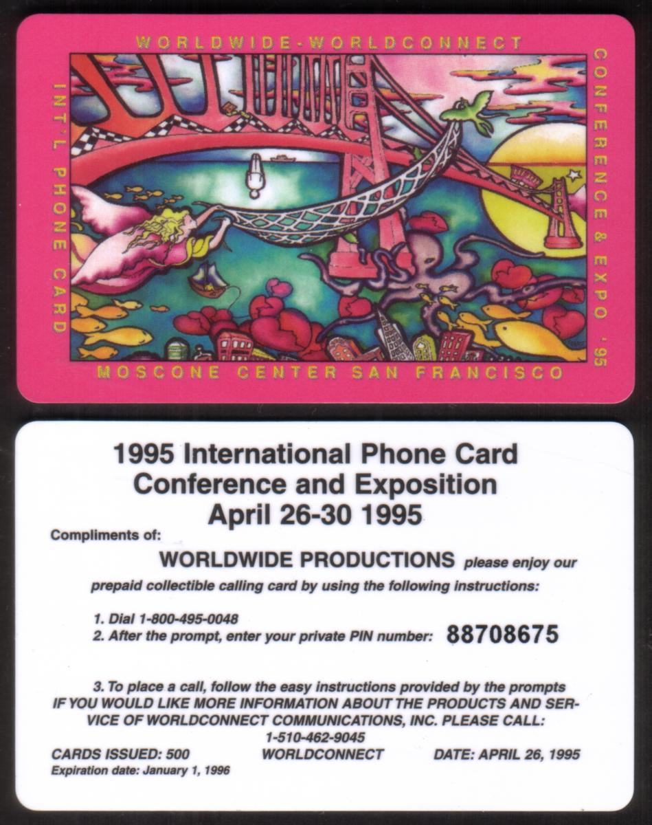 Additional text visible on the card includes "International Phone Card Conference & Expo San Francisco," which clearly identifies the occasion commemorated by the phone card. The specific event and location make this item a collector's piece linked to phone card history and telecommunications events from the mid-1990s. The card connects WorldConnect Communications with the phone industry through this special edition release.