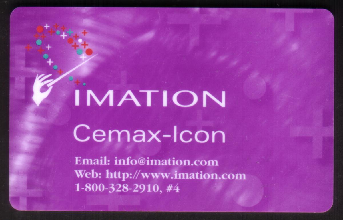 This collectible promotional card features the logo and branding of Imation Cemax-Icon, a company involved in software development and network systems integration for medical imaging and information management systems. The card is identified with the designation "10m Imation Cemax-Icon Promo," highlighting its promotional nature. The front of the card displays the company name "Imation Cemax-Icon" prominently, along with "Magic & Wand" and "PromoTel," suggesting a focus on technology or communications.