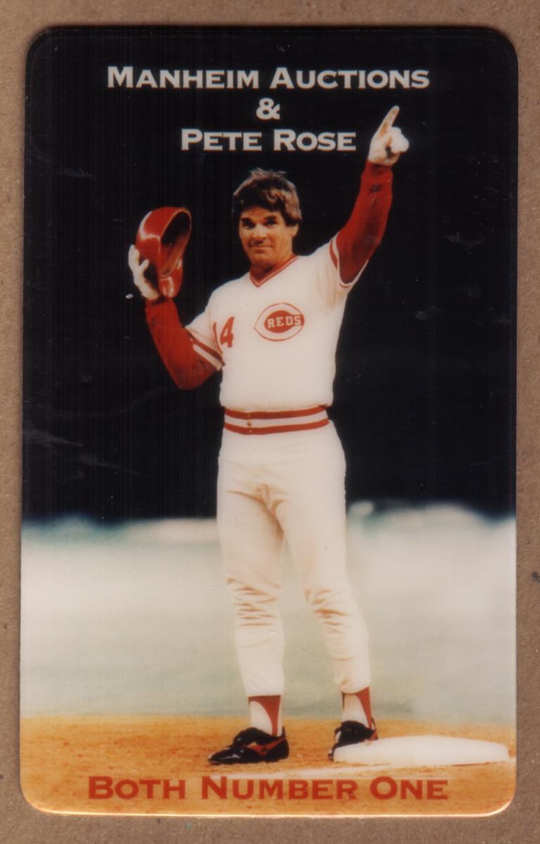 At the top of the card, the text reads "Manheim Auctions & Pete Rose" in white lettering. At the bottom, in bold red text, it says "BOTH NUMBER ONE." The card captures the association between Manheim Auctions in California and the legendary baseball player Pete Rose, highlighting their connection in the context of baseball collectibles.