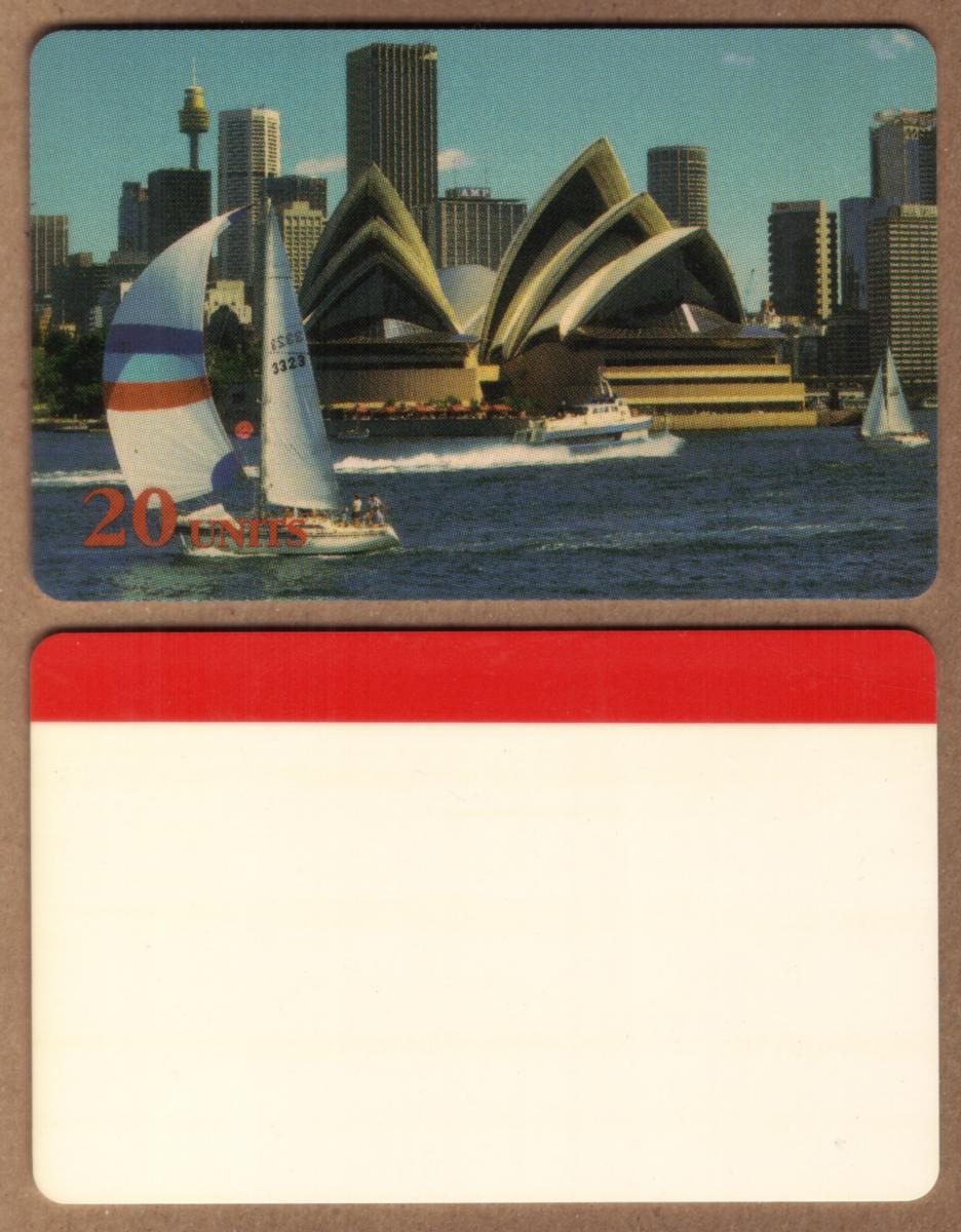 The collectible phone card features a vibrant image of the Sydney Harbor Opera House, a world-famous architectural landmark located in Sydney, Australia. The card shows the Opera House set against a clear blue sky, with the iconic white sail-like shells prominently in view. The surrounding harbor waters are visible at the bottom of the image, highlighting Sydney’s picturesque harbors. The card's design reflects themes of opera music, classical music, and musical arts, emphasizing the cultural significance of the Sydney Harbor Opera House as a center for operas and performances.