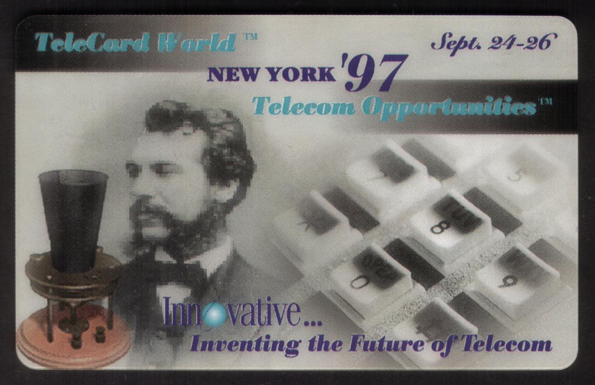 The card specifically references "World New York '97," pinpointing the World Telecommunication event held in New York City in 1997. It features the name Alexander Graham Bell, the inventor of the telephone, tying the historical significance of his work to advances in telecom technology. The branding "Worldwide Digital" and "ITC" appear on the card, suggesting the involvement of companies specializing in digital telecommunications and Integrated Telecommunication Card services.