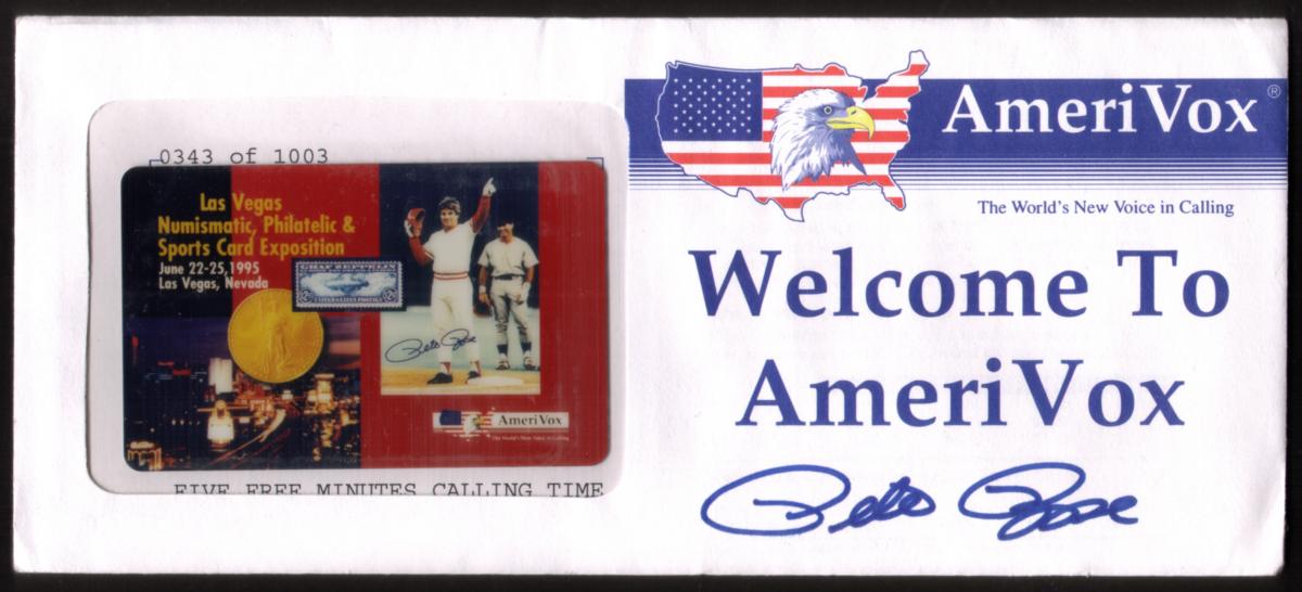 This collectible item is a special baseball-themed phone card issued for the Las Vegas Coin, Stamp & Sports Card Expo. It features MLB legend Pete Rose, whose original autograph is prominently displayed in black ink across the lower portion of the card. The design highlights the intersection of major league baseball memorabilia and collectible phone cards.