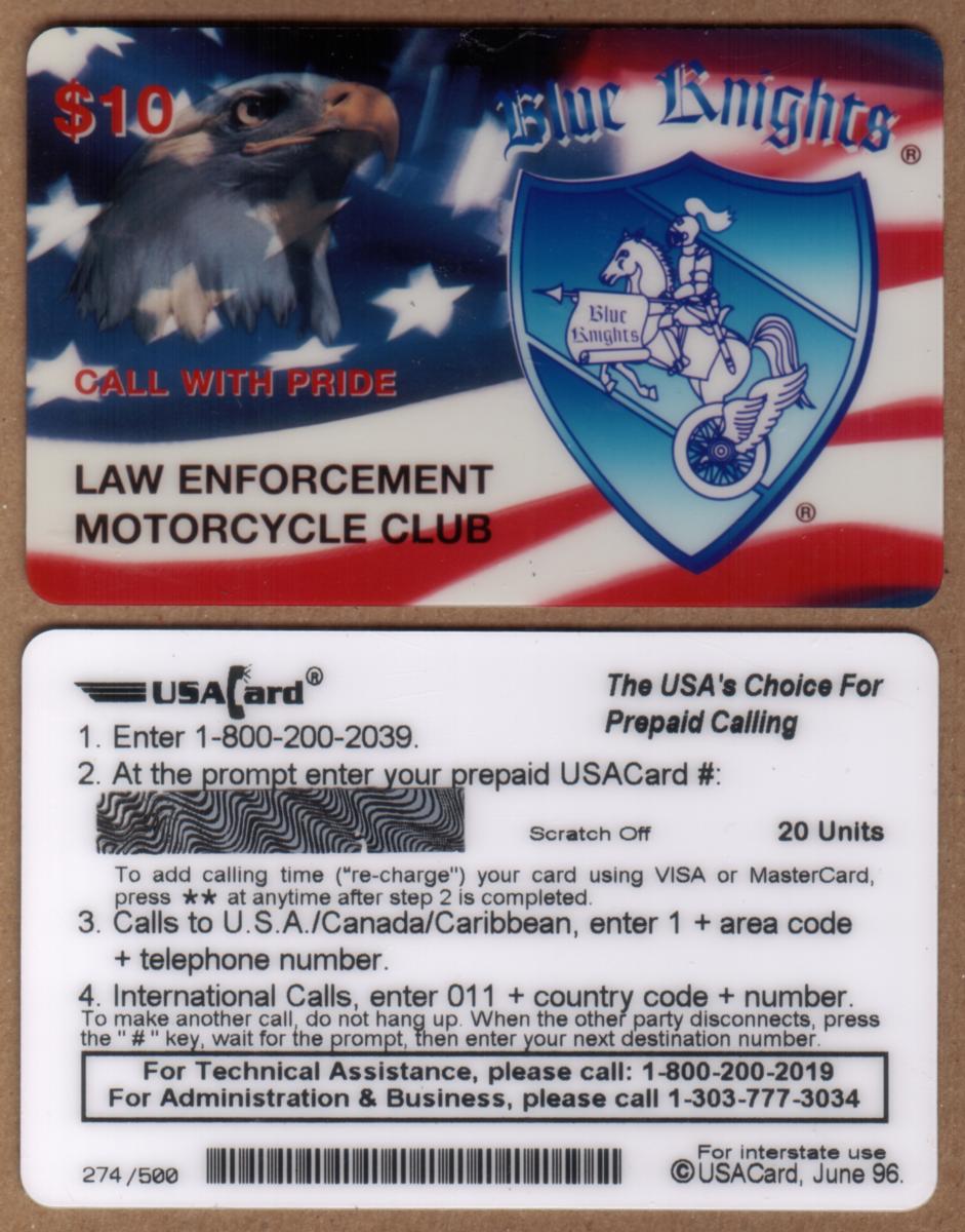 The text on the card includes the phrases "POLICE," "Call with Pride," and "$10," clearly indicating the card’s value and purpose for phone calls. The card also includes the issuing entity, USACard Corporation, printed in the lower right area. The overall design reflects law enforcement solidarity and pride associated with the Blue Knights Motorcycle Club.