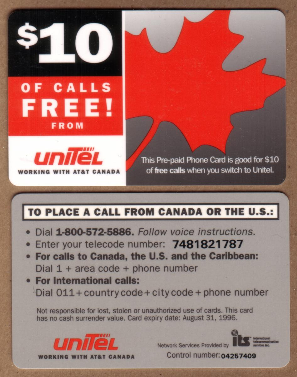 Overall, the phone card is a promotional item used to facilitate international calling services linked to UniTel and AT&T Canada. It serves as a collectible piece due to its distinctive marking and the symbolic use of the Canadian Maple Leaf. The card’s clean layout features company logos alongside the indication of its $10 value for calling purposes.