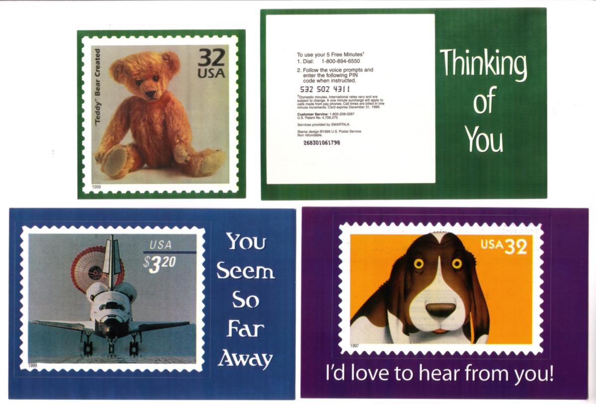 Each card remains factory sealed within the set of four, preserving its collectible status. These phone card stickers serve as a distinctive piece of telecommunications memorabilia linked to the USPS and SmarTalk TeleServices.