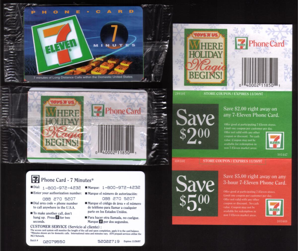 This collectible phone card features logos from 7-Eleven and Toys R Us, highlighting a Holiday Promo collaboration between the two companies. The card includes the prominent text "7 Eleven & Toys R Us Holiday Promo" alongside the keypads for dialing. The 7-Eleven logo shows the iconic green, orange, and red colors with the number 7 and the word "Eleven," while the Toys R Us logo is colorful with its signature playful lettering. The card is issued by ATN-MCI and is sealed, with a stated expiration date of November 30, 1997.