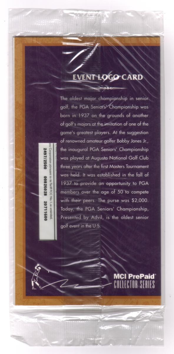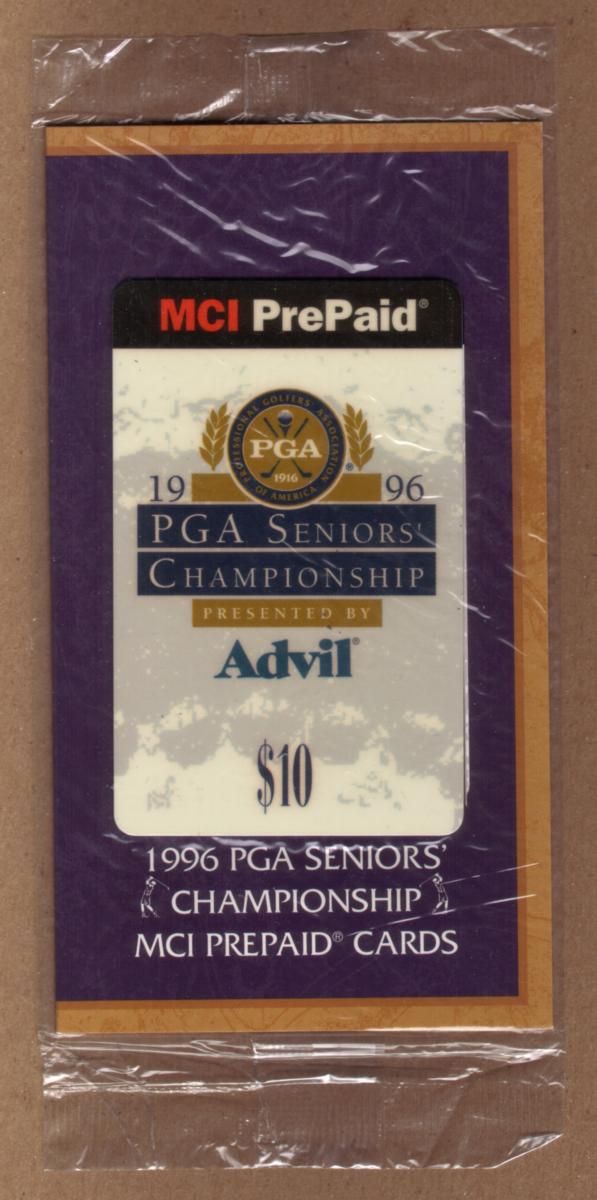 The lower portion of the packaging repeats the event name "1996 PGA Seniors Championship" along with "MCI PrePaid Cards" in white uppercase lettering. This prepaid card combines professional golfing heritage with telecommunications branding, making it a collectible item associated with the PGA Senior Championship and its official sponsor Advil in 1996.