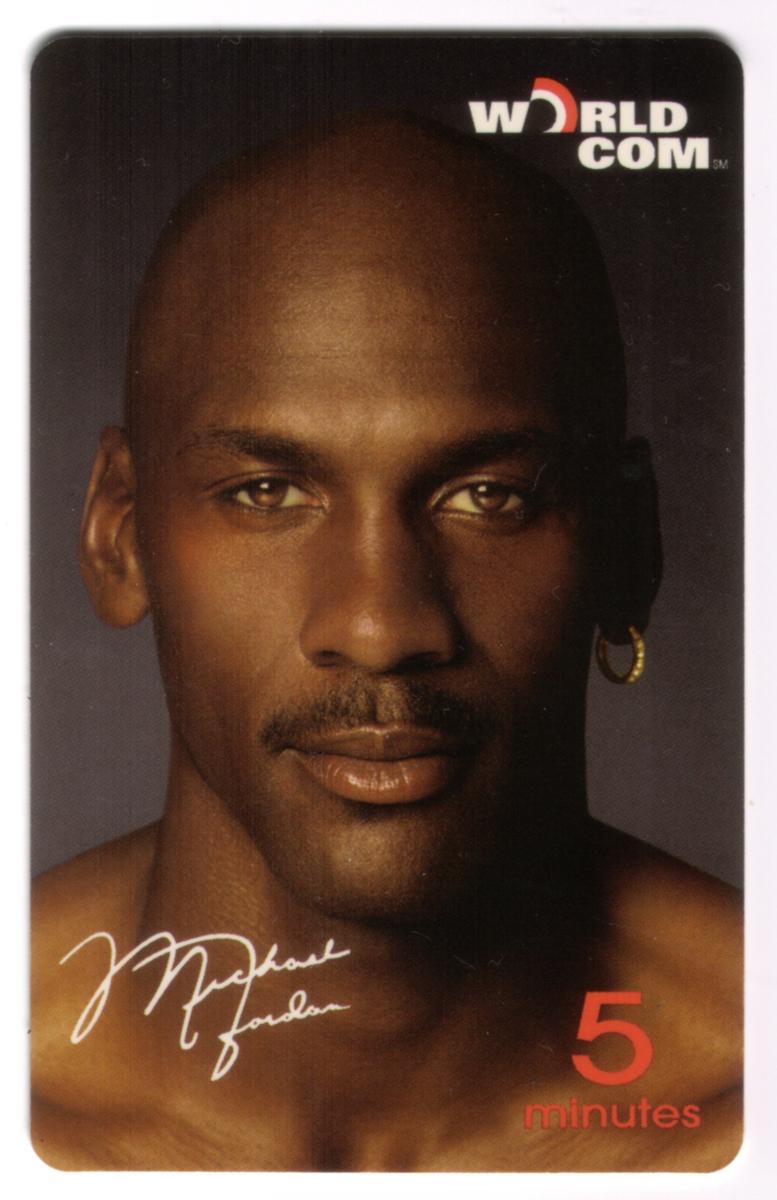 At the top right corner is the WorldCom logo in white and orange. Near the bottom left corner is Michael Jordan’s signature printed in white script. The card indicates a usage time of "5 minutes" in bold red text at the bottom right.