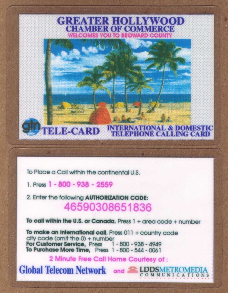 The card includes printed text reading "Hollywood Florida" in bold letters near the top right. Additional inscriptions on the card reference "LDDS Metromedia," "Broward County Florida," and "Greater Hollywood Chamber of Commerce (Florida)." The card is laminated and includes branding for "Global Telecom" and "LDDS," indicating its telecommunications affiliation. The value of the card is stated as "2m," representing two monetary units.