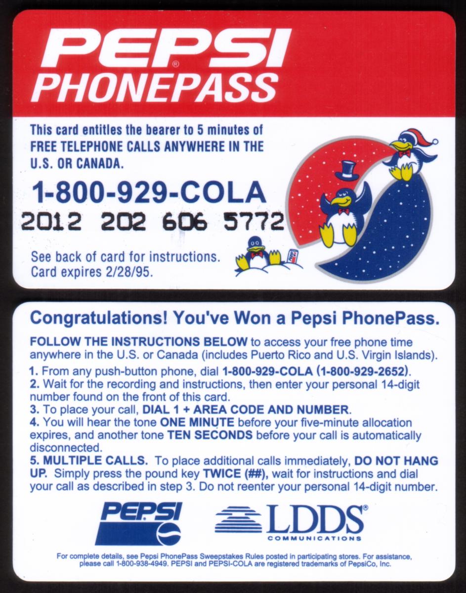 The card also bears the branding of “Pepsi,” presented in its recognizable font and style, reinforcing the association with the popular soft drink company. Additional text on the card references the “5m Pepsi Penguins Pepsi PhonePass 1994 Winter Holiday Contest Promo,” which identifies this card as part of a 1994 promotional campaign. The Pepsi Penguin character is a central figure, repeated across the card and designed to appeal to collectors and fans of holiday-themed merchandise. The phone card was issued by LDDS WorldCom, which is indicated on the card, linking it to the telecommunications company responsible for the card’s distribution.