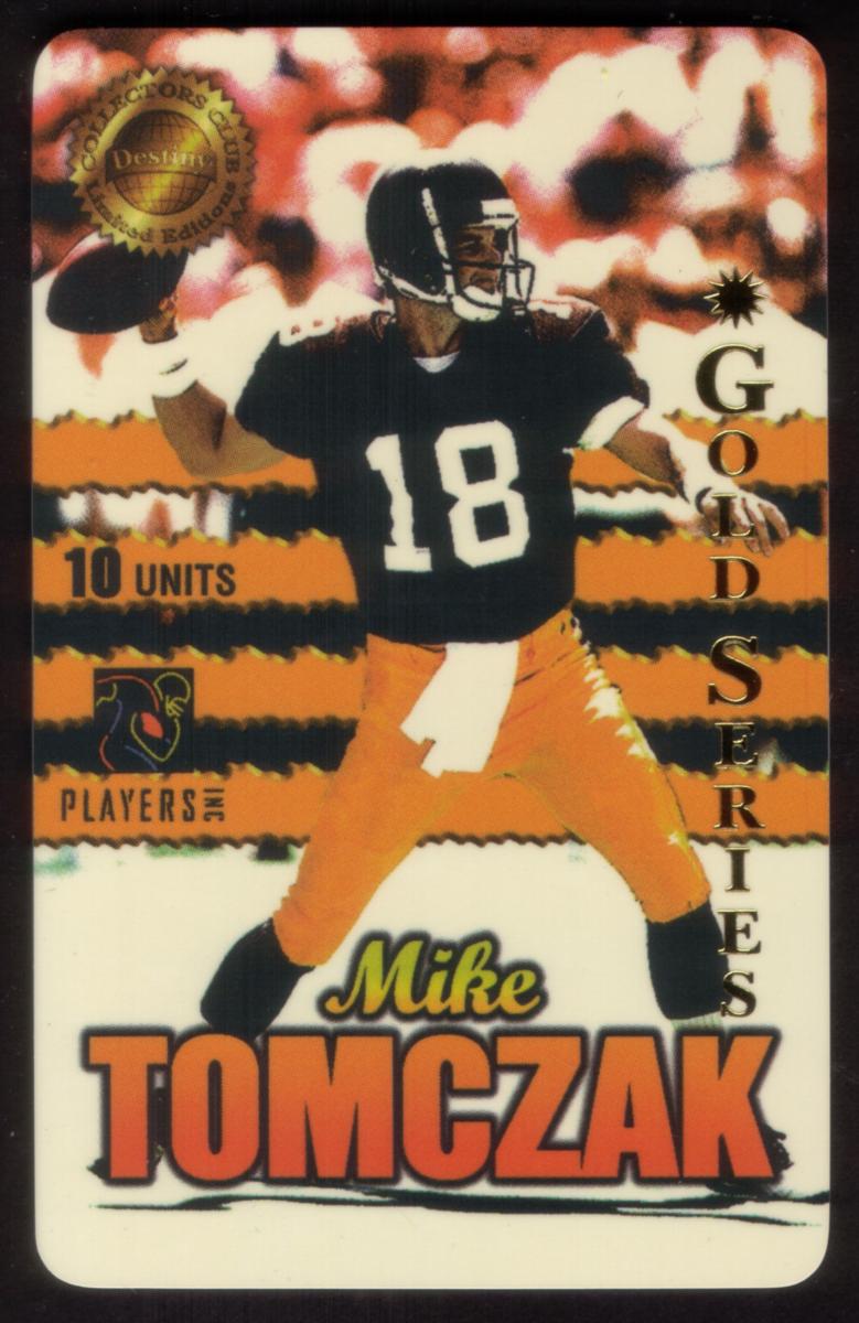 Overall, this card is a sports collectible centered on Mike Tomczak’s NFL career with the Pittsburgh Steelers and is part of the Destiny Telecomm series. It celebrates football as a sport and Tomczak’s contribution as a quarterback, making it a valuable item for collectors of NFL memorabilia and football-related cards.
