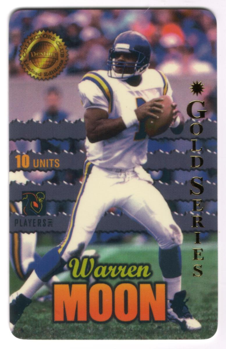 Produced by Destiny Telecom, this limited edition card connects to both football and NFL themes. Its serial number confirms it is a collectible item with a finite quantity, enhancing its value for fans and collectors of Warren Moon memorabilia and American football history.
