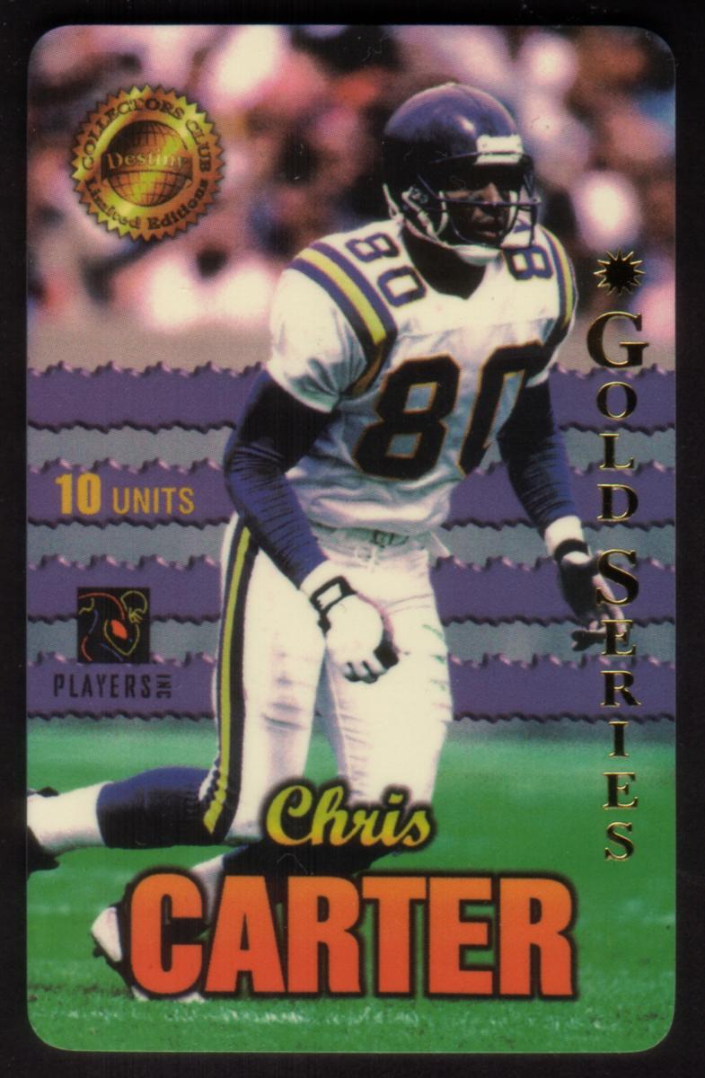 This collectible card features Chris Carter, a wide receiver with the Minnesota Vikings, identified by his name and position abbreviation "WR" on the card. The card highlights Carter’s association with the NFL and depicts him in a football uniform with a purple jersey and white pants. The background includes a stylized design with gold and black accents, enhancing the card’s visual appeal.