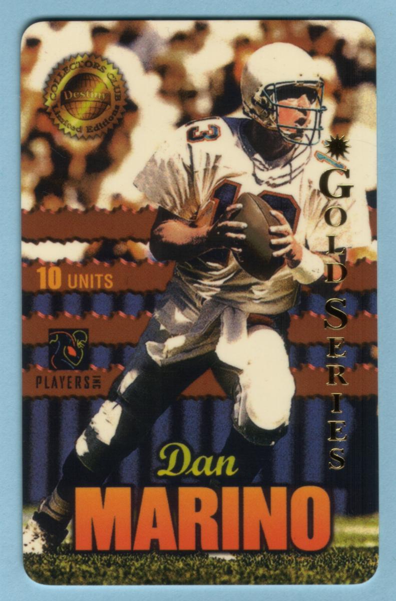 No other players appear in the image. The card highlights Dan Marino’s role as a key player in football history, focusing on his Miami Dolphins affiliation and quarterback position. The card is a collectible item tied to the NFL and football memorabilia collectors.