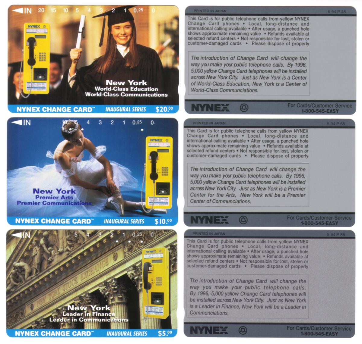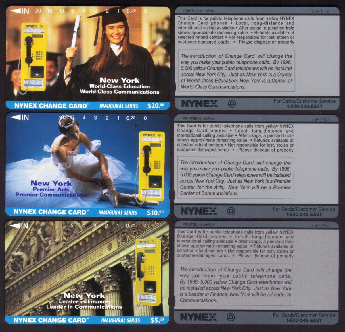 A 1994 Inaugural Series set featuring rare unencoded NYNEX Change Cards with $20, $10, and $5 values. Highlights New York City’s education, arts, and finance. |