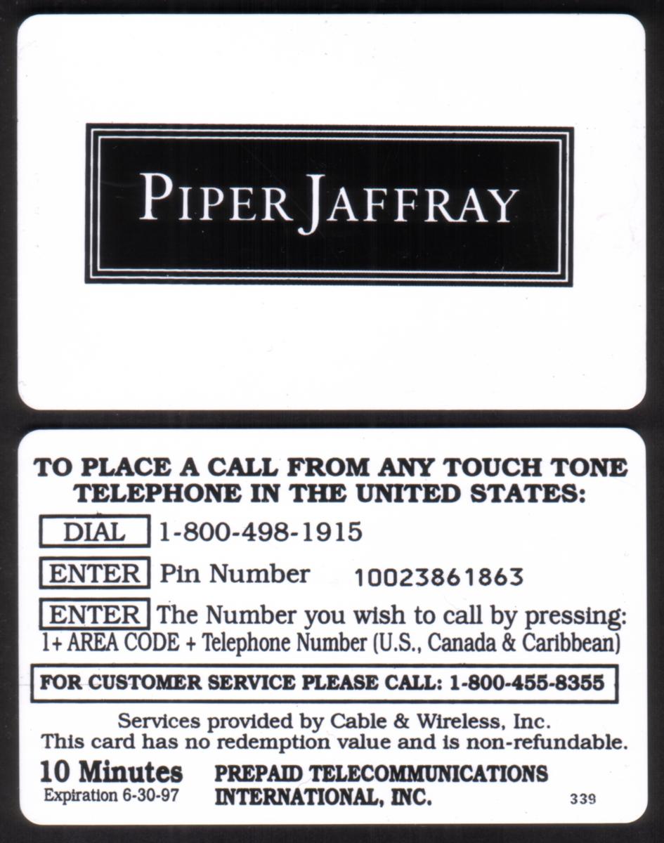 This collectible prepaid telecom card features the name Piper Jaffray Investment Bank & Securities prominently displayed near the top, indicating its connection to financial services and investments. The card has a value of 10 million units, noted clearly as "10m." The design includes the Cable & Wireless logo, representing the telecommunications company behind the prepaid service. The card is marked as "USED."