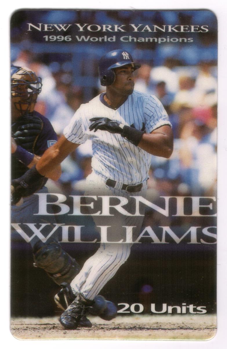 This collectible card features Bernie Williams, the New York Yankees outfielder, prominently displayed in the foreground. Williams is shown holding a baseball bat, wearing the classic New York Yankees uniform with the team’s iconic interlocking "NY" logo visible on his cap. The image captures a moment from the 1996 season, a year when the Yankees won the World Series. The background includes artistic renditions of several baseballs, emphasizing the sport of Major League Baseball (MLB).