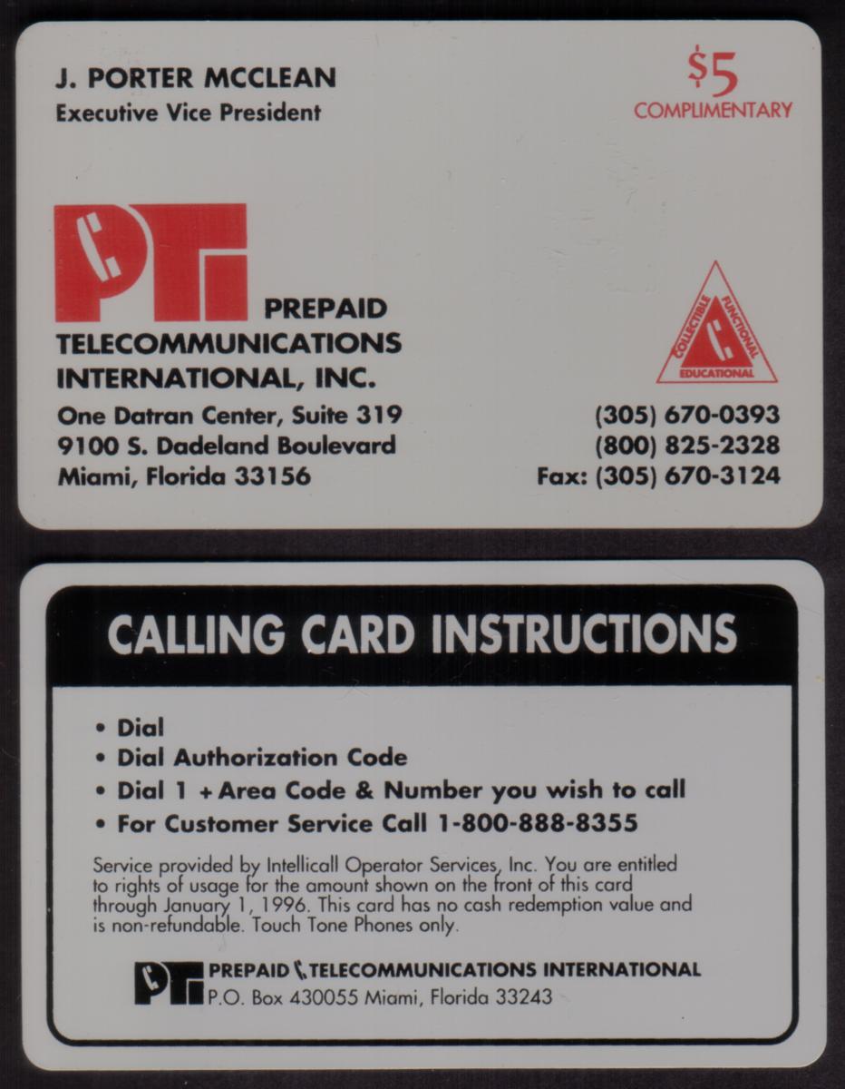 This collectible prepaid telecommunications card features a promotional design representing Prepaid Telecom International. The card has a face value of $5 for international telecommunications use. It prominently displays the name J Porter McClean, identified as Vice President of PTI, alongside the designation "Complimentary Business Card SPECIMEN." The text “Prepaid Telecom. Intl” is printed on the card, emphasizing its functional purpose for prepaid international telecommunications services.