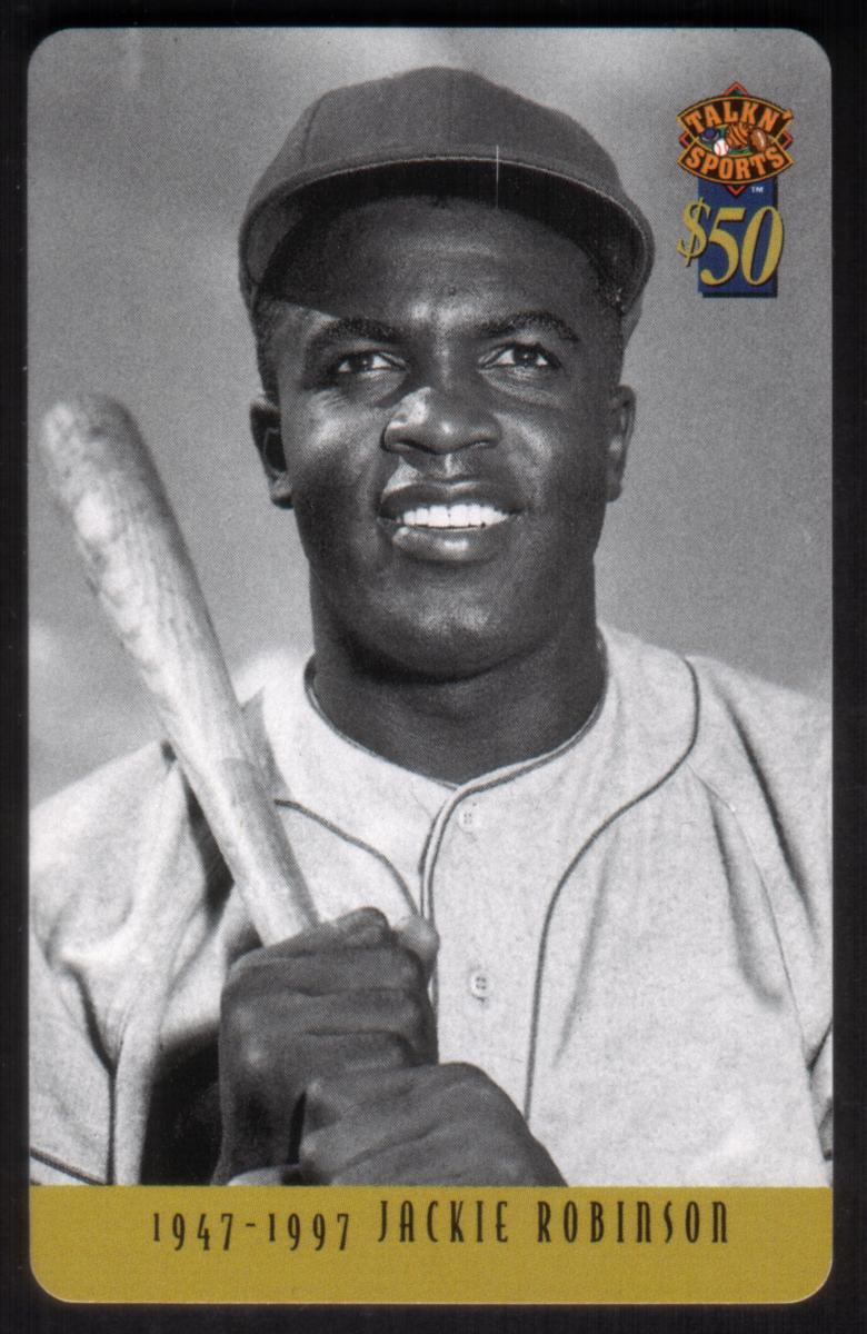 The design includes a gold banner at the bottom with the text "1947-1997 JACKIE ROBINSON," marking the 50th anniversary of Robinson’s debut in Major League Baseball. The upper right corner displays the "Talk N’ Sports" logo along with a value of "$50."