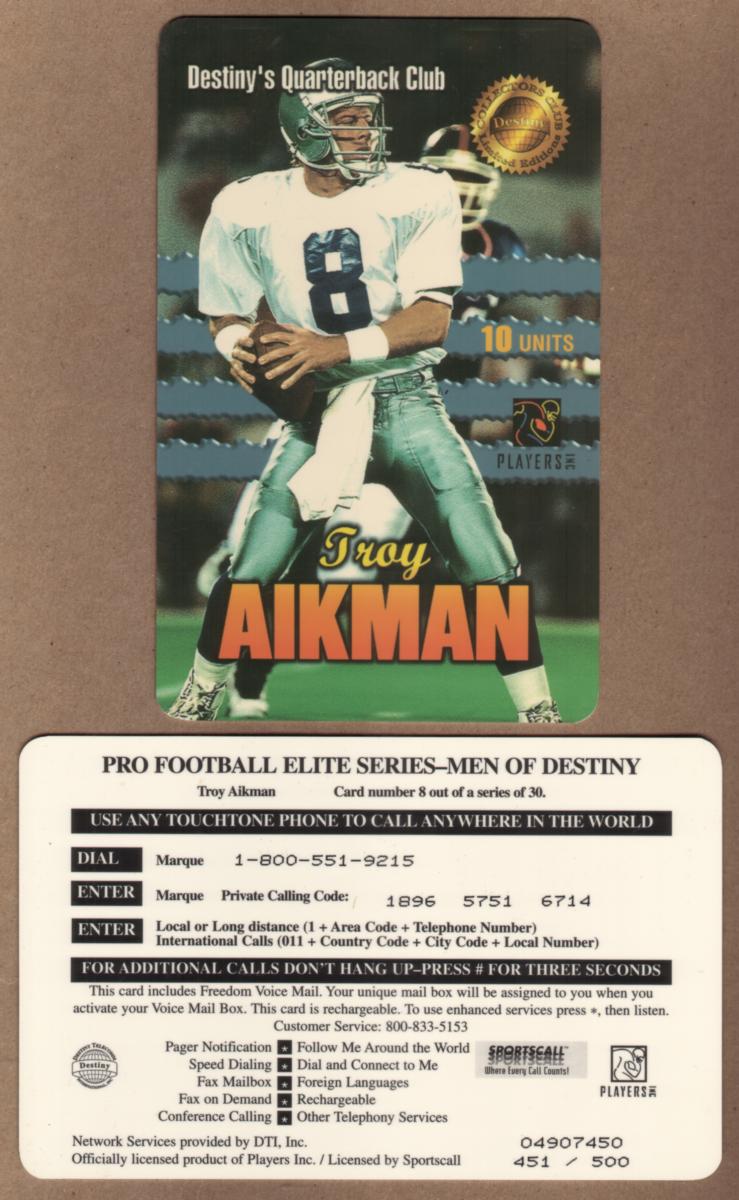 Printed text on the card includes the title "Destiny Quarterback Club," "Pro Football Elite Series," and "Men of Destiny," alongside Troy Aikman’s name and his position (QB) with Dallas. The card was issued by Destiny Telecom and is part of a collectible football card set showcasing prominent NFL figures.
