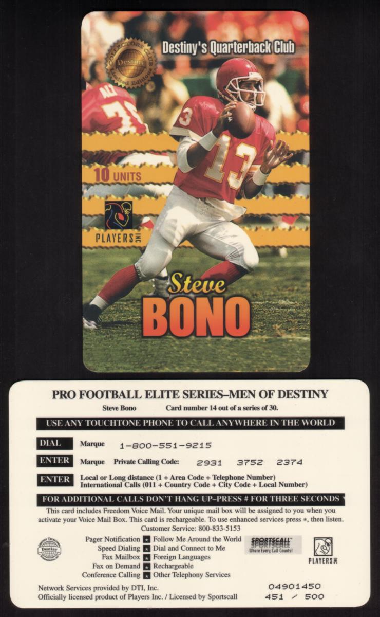 The design includes the NFL and National Football League logos, reinforcing its official connection to professional American football. Steve Bono’s name and position as a quarterback (QB) appear prominently, along with the Kansas City Chiefs team name. The Destiny Telecomm brand is displayed on the card, linking it to the telecommunications company involved in producing the collectible.