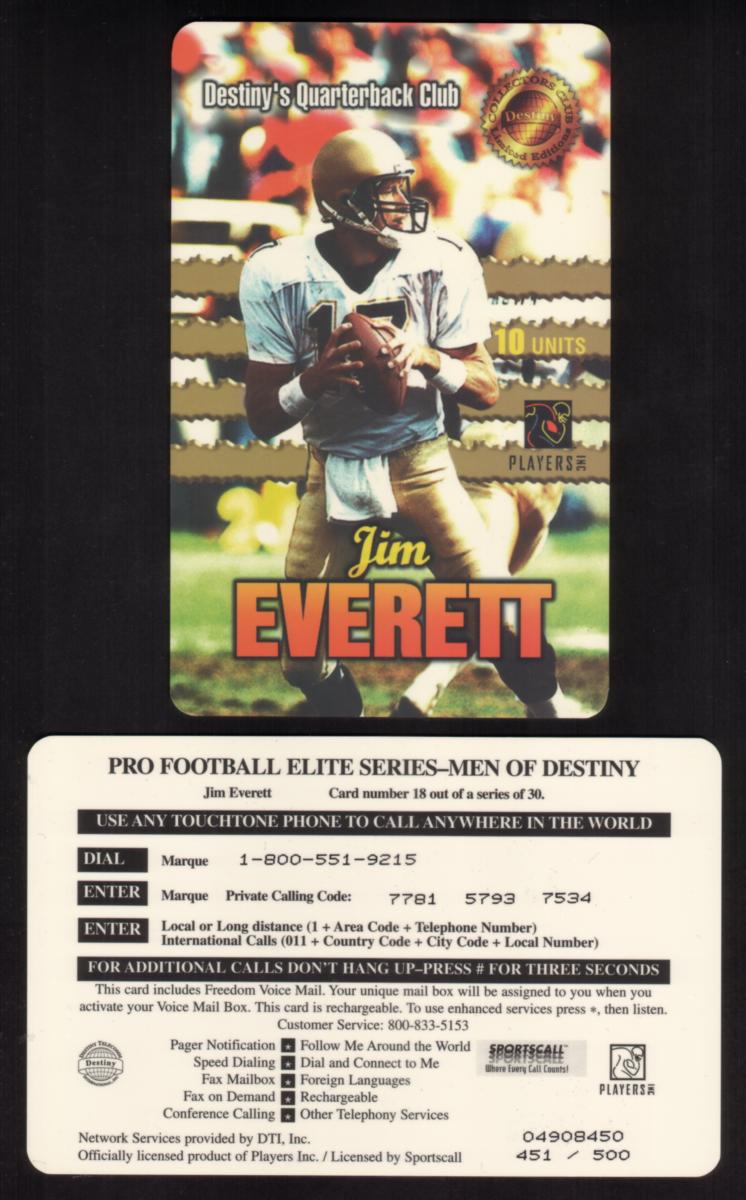 The front of the card includes the text "Jim Everett QB New Orleans" and displays a football prominently, further emphasizing the sport of American football and the NFL affiliation. The card’s design integrates visual elements associated with professional football, including imagery of footballs and dynamic graphics. The Destiny Telecomm logo is printed on the card, linking it to the Destiny brand.