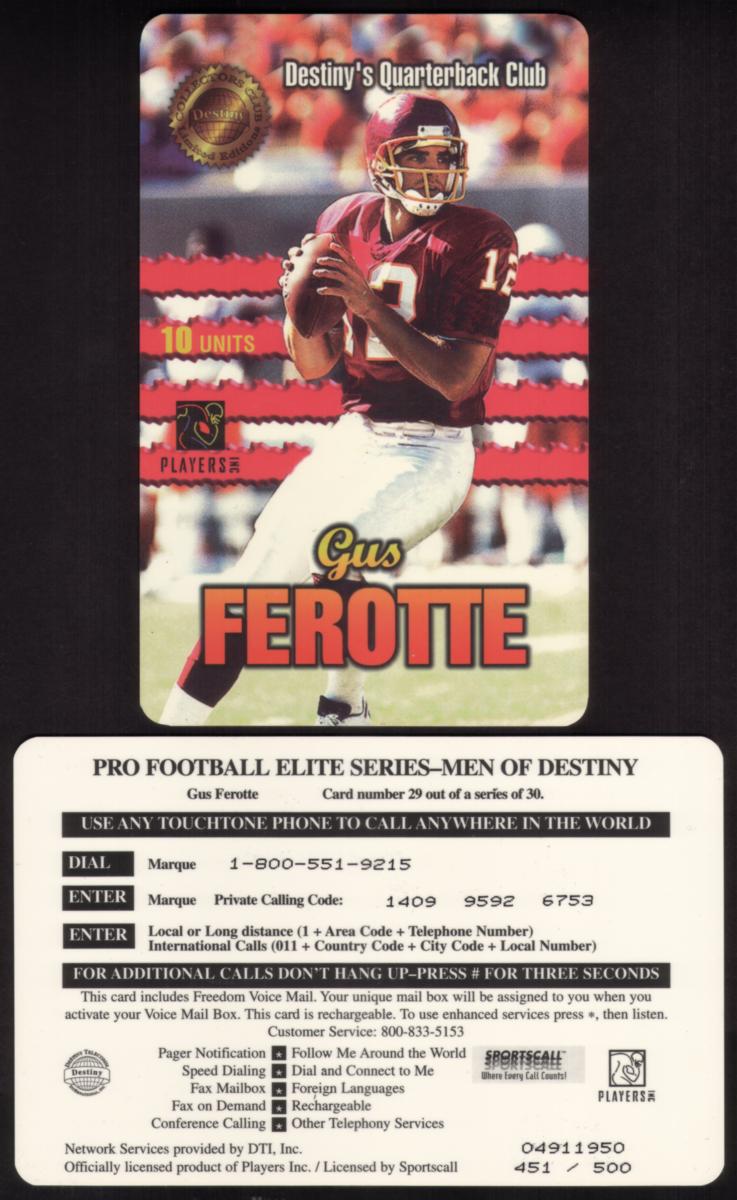 This collectible card features Gus Ferotte, a quarterback for the Washington football team, as part of the Men of Destiny series. The card is numbered 29 of 30 in the Pro Football Elite series under the National Football League (NFL) category. It is a jumbo-sized card measuring approximately 4 1/4 inches by 6 3/4 inches and is from Destiny Telecomm’s Destiny’s Quarterback Club collection.
