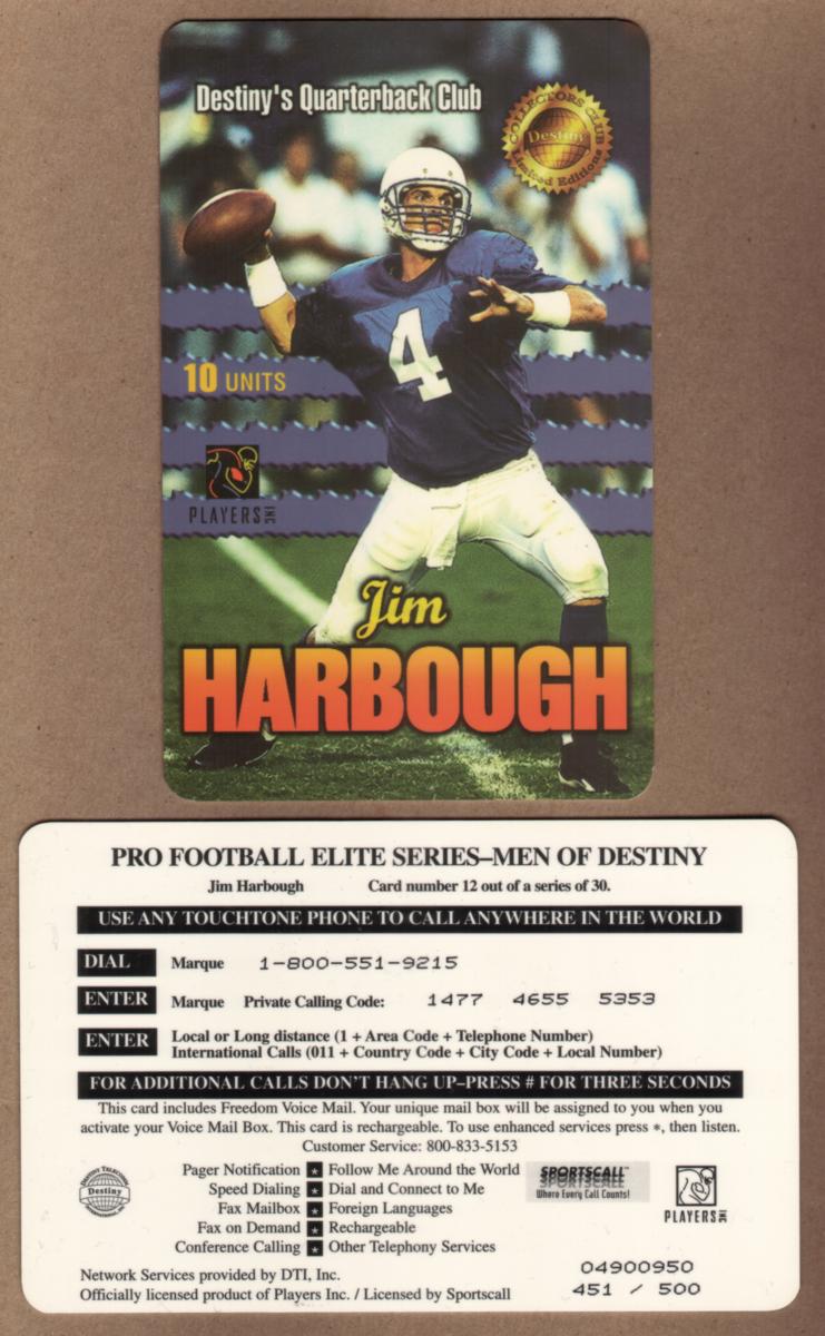 This card is a specialized collectible within the Destiny’s Quarterback Club collection, focusing on pro football players. The detailed presentation of Jim Harbaugh emphasizes his sports career, with the Indianapolis quarterback position clearly indicated to collectors and fans.