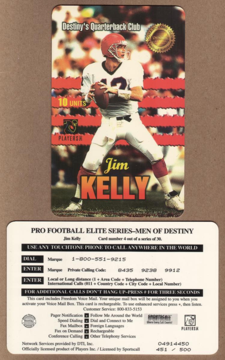 Additional text on the card includes “Destiny Telecomm” and “Pro Football Elite,” which links it to its manufacturing and series identity. The card prominently identifies Jim Kelly’s role within the NFL, emphasizing his status as a key player. This collectible is part of Destiny's “Men of Destiny” football collectibles, honoring significant football figures in a premium-sized format.