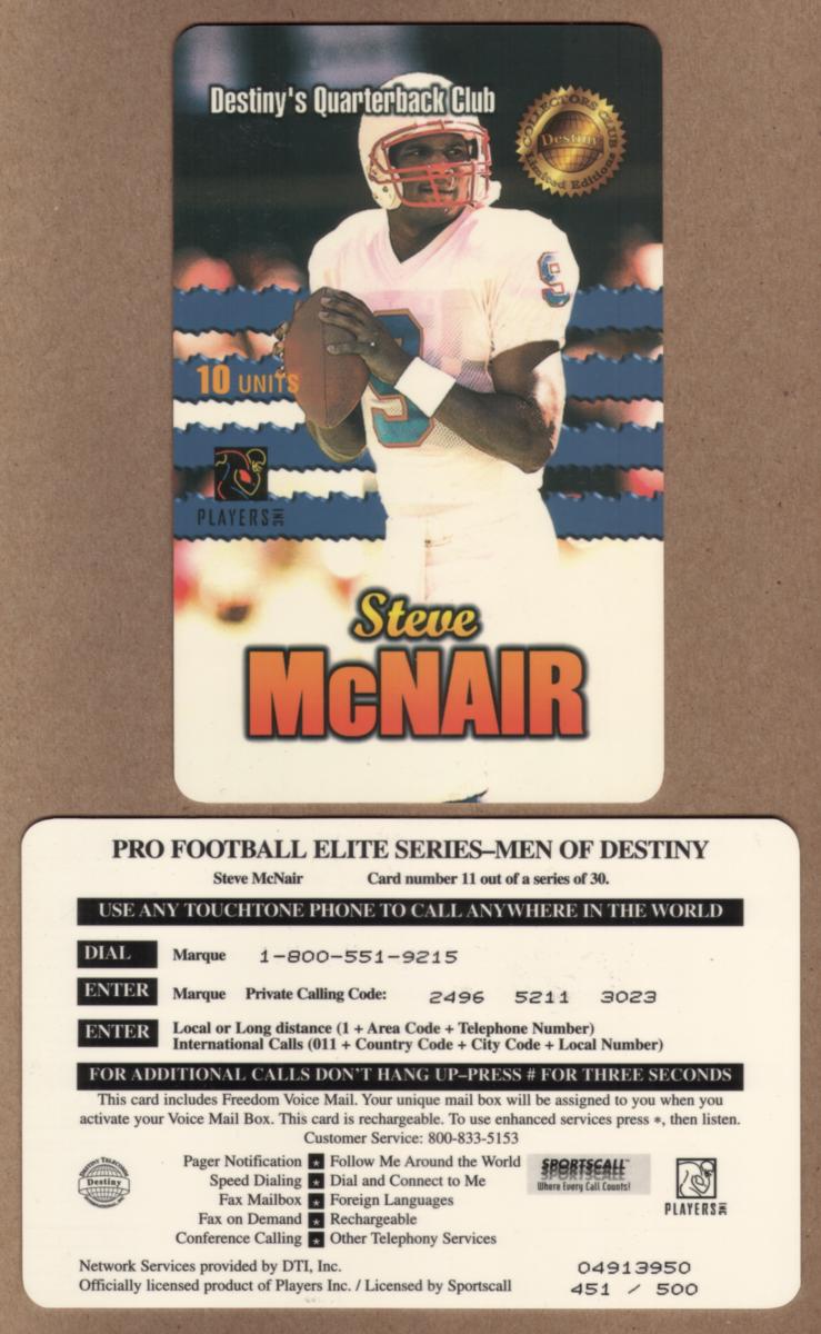 This collectible jumbo phone card features Steve McNair, the quarterback for the Houston football team in the National Football League. The card measures approximately 4 1/4 inches by 6 3/4 inches. It is part of the Destiny’s Quarterback Club series, specifically from the Pro Football Elite series, labeled as "Men of Destiny" and is card number 11 out of 30.