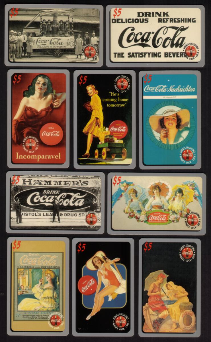 The detailed imagery on each card includes several versions of the Coca-Cola and Coke logos, alongside stylized vintage ad graphics. These elements reflect the evolution of Coca-Cola’s marketing strategies over time, making this set a valuable piece of Coke memorabilia for collectors interested in the brand’s advertising legacy.