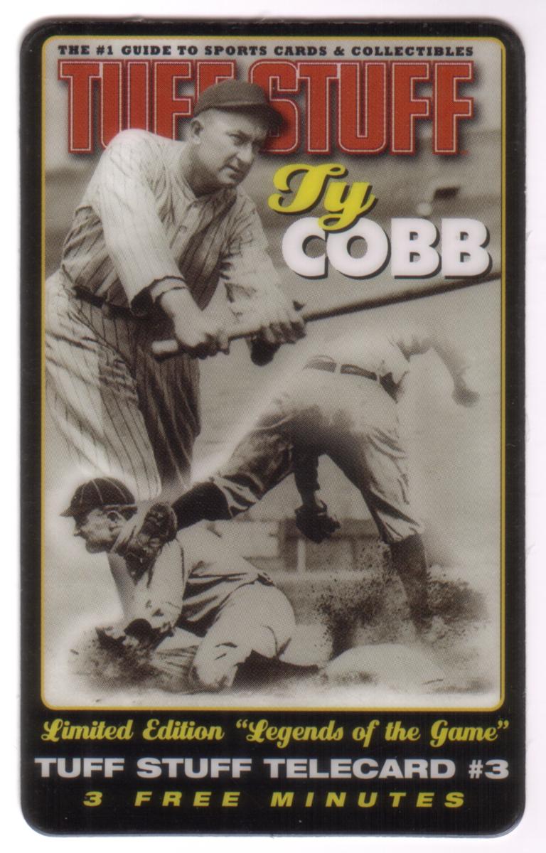 This collectible telecard features Ty Cobb, one of baseball’s most legendary figures. The card is identified as Telecard #3 from the "Legends of the Game" series, issued by SportsCom (ATN). It is associated with Major League Baseball and highlights Ty Cobb’s status in the Baseball Hall of Fame. The layout includes the 3M Tuff Stuff Magazine logo, further emphasizing the connection to professional baseball memorabilia.