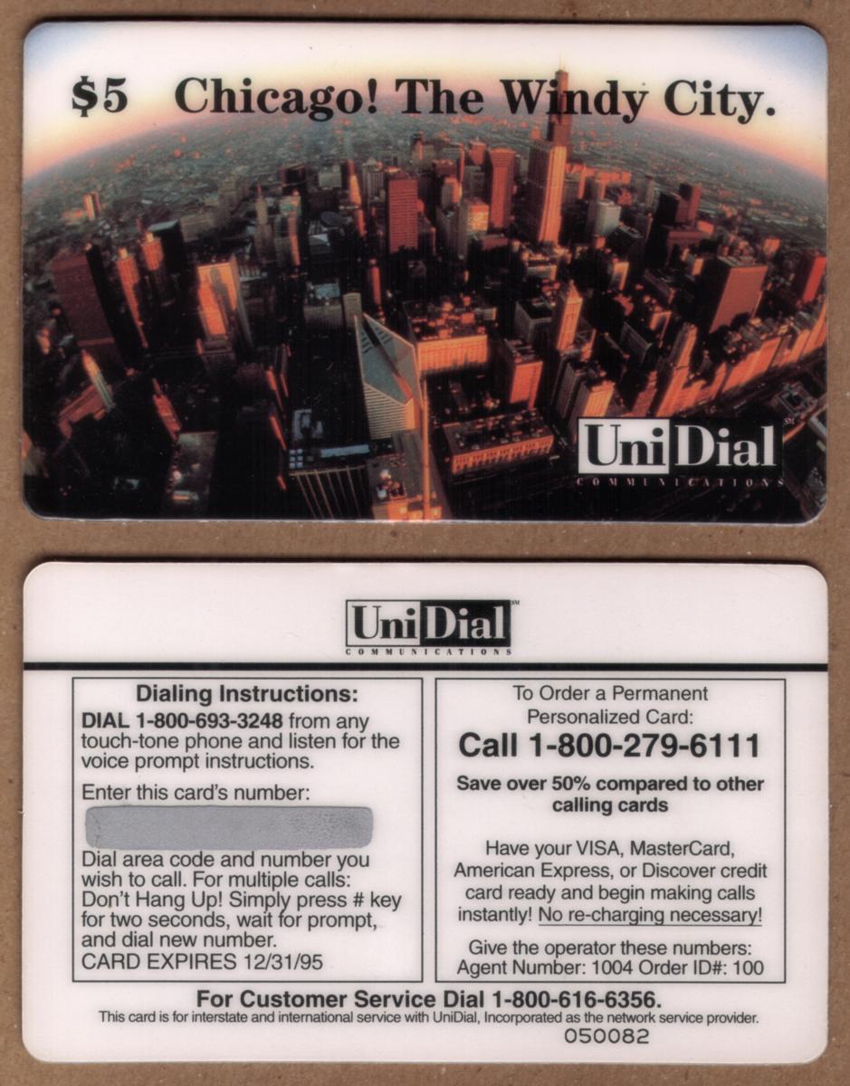 The card has a denomination marked as $5, reflecting its value for use with the telecommunications services provided by UniDial Communications. The overall design focuses on the distinctive and recognizable features of Chicago and pays tribute to the city’s architecture and setting on Lake Michigan.
