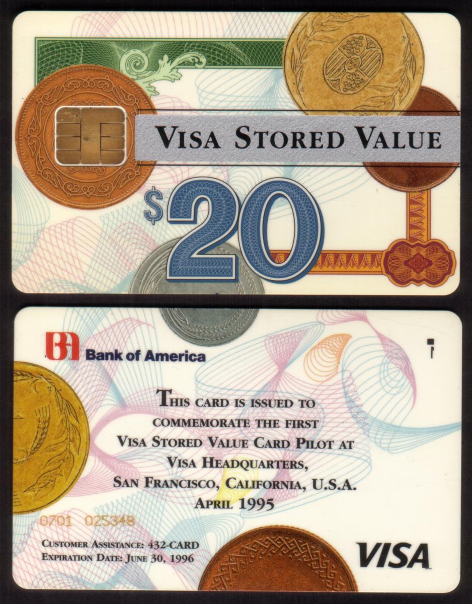 Overall, this Bank of America Visa Cash Card is a collectible example of the early use of chip technology for financial transactions. It is a smart, stored value bank card with a $20 credit amount enabled by Visa Cash, featuring official branding from both Bank of America and Visa.