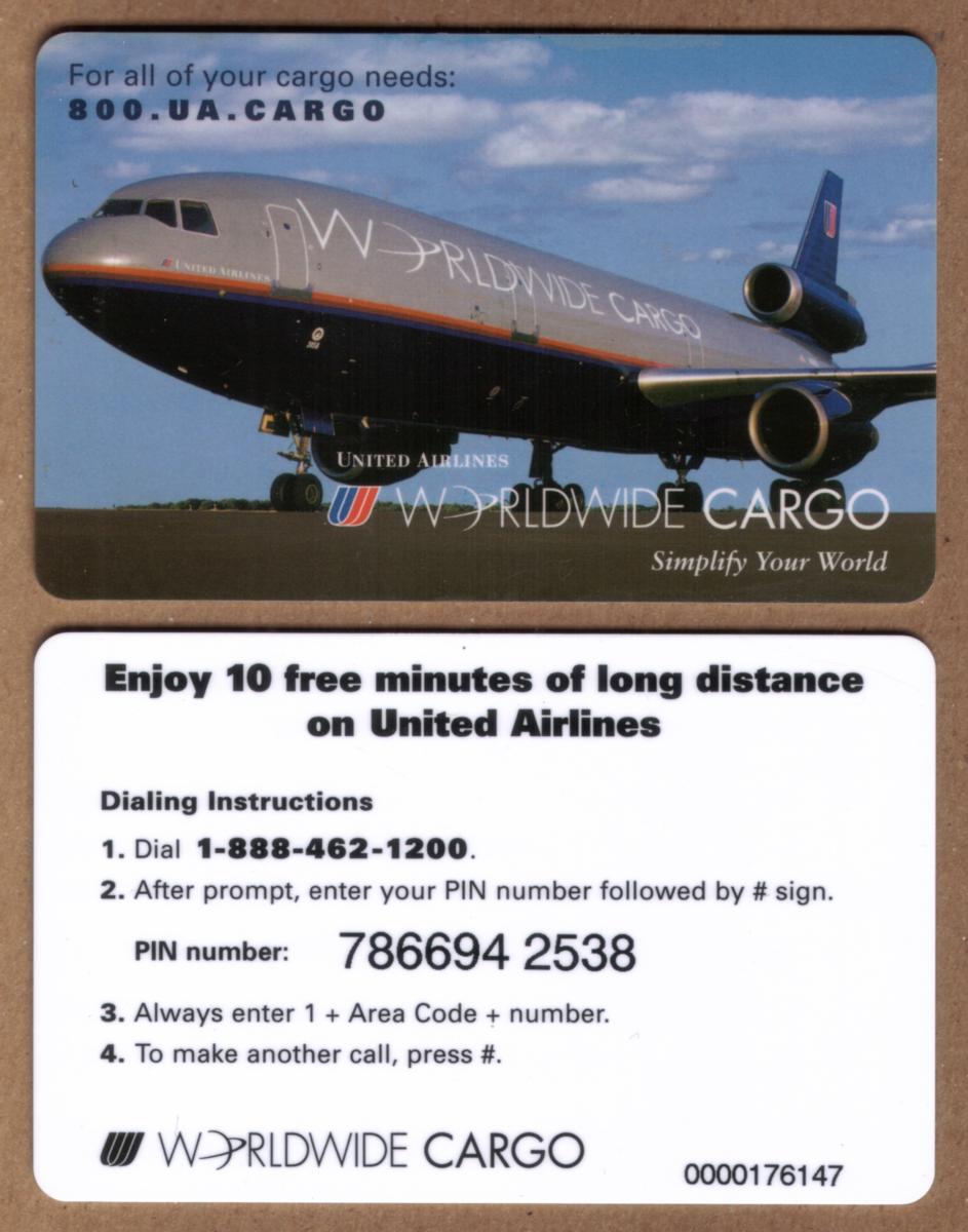The design on the card includes clean, bold text stating "United Airlines Worldwide Cargo" and "Airlines 10m," referencing the promotional value or theme connected to airline travel and cargo transport. The image showcases a sleek, white jet airplane, typical of commercial aircraft used by United Airlines, symbolizing the company’s extensive air travel and shipping capabilities.
