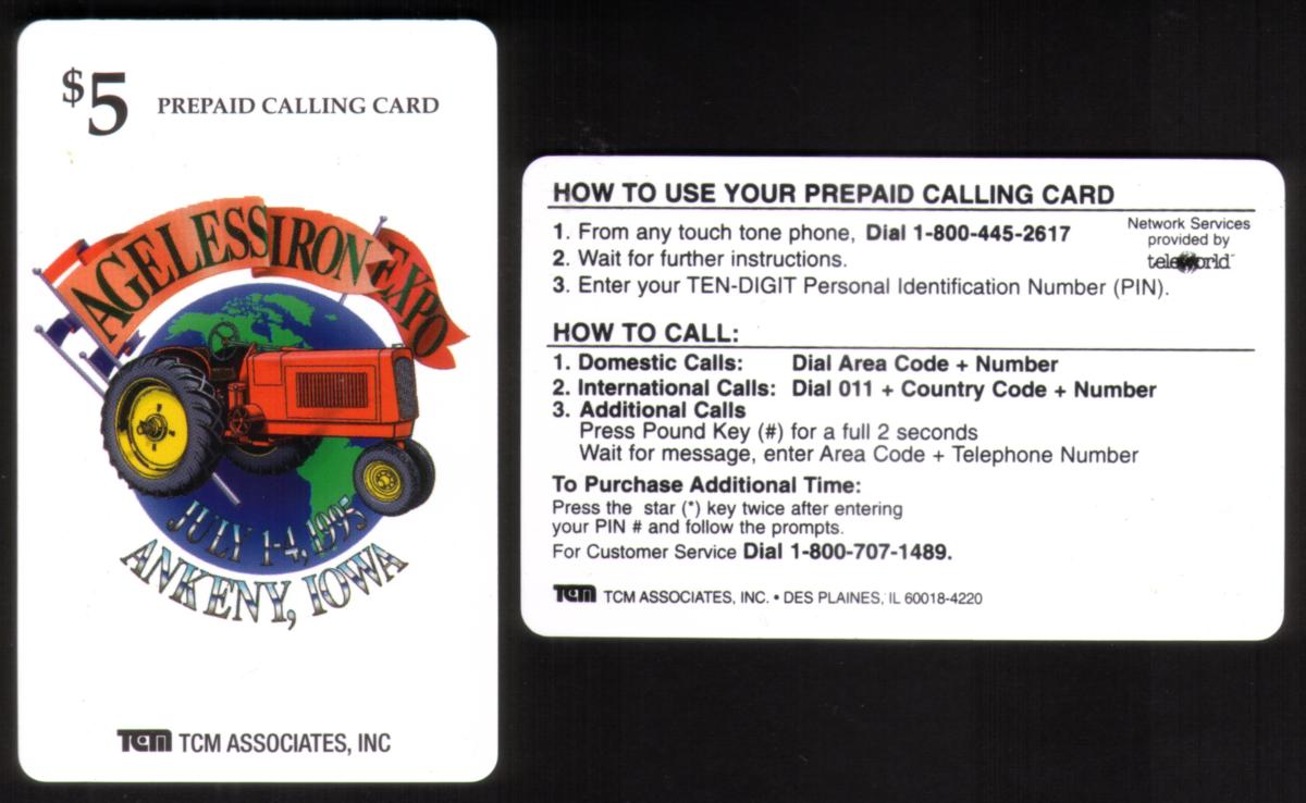 This collectible phone card features a detailed design related to the Ageless Iron Expo held in Ankeny, Iowa, in July 1995. The card prominently displays the logo of an Old Tractor, emphasizing the theme of vintage agricultural machinery. The event name, "Ageless Iron Expo Ankeny Iowa 7/95," is presented clearly, signifying a gathering dedicated to showcasing historic tractors and related equipment.
