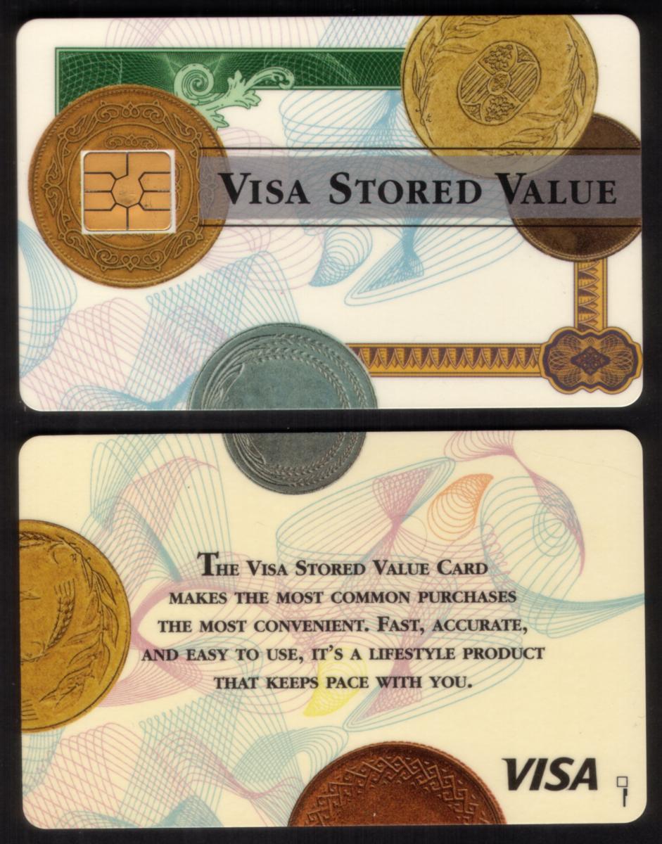 This card is a bank card used to demonstrate stored value capabilities and chip technology. The presence of the chip and VISA branding confirms it is a smart card designed for electronic financial transactions. The overall layout and text elements emphasize the card’s status as a demo unit, not for actual monetary use.