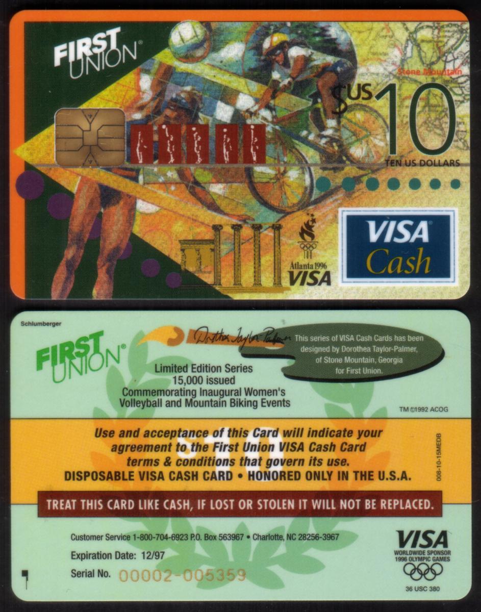 This collectible Visa Cash Card features a stored value of $10 and is issued by First Union Corp. Bank. The card is an Olympic-themed bank card that highlights two sports: women’s volleyball and mountain biking. The front of the card displays the official Olympic logo, prominently located near the top left corner. The name “First Union” appears in clear text, identifying the banking institution responsible for this card.