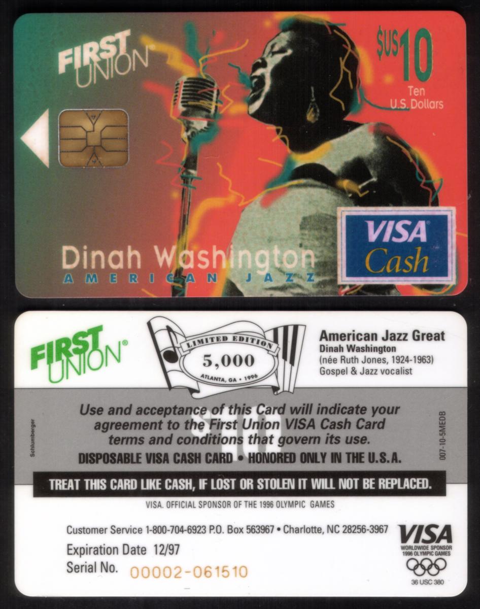 This collectible Visa Cash Card features a portrait of Dinah Washington, the renowned gospel and jazz vocalist born Ruth Jones. The card is issued by First Union Corp. Bank and has a stored value of $10. The design includes the name "Dinah Washington" prominently displayed, emphasizing her importance as a celebrated jazz singer. The card branding clearly shows the Visa Cash logo, indicating its function as a Visa Cash Bank Card.