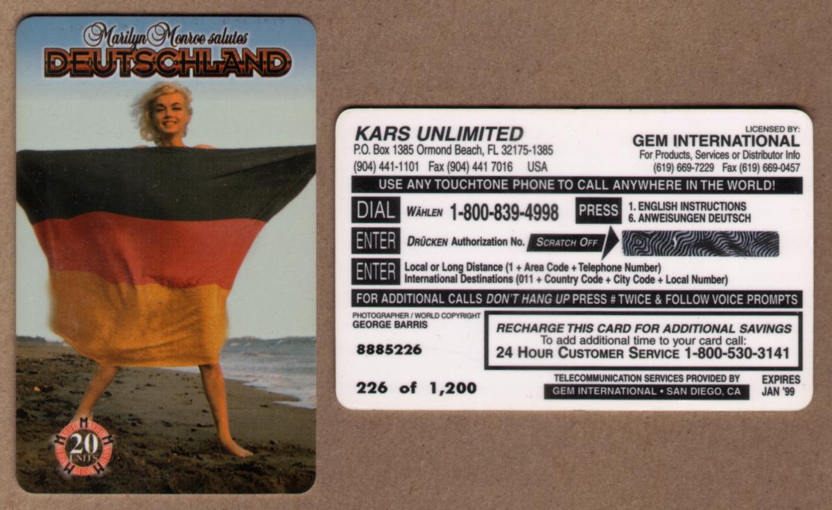 This item is a collectible entertainment card featuring a world-famous celebrity, Marilyn Monroe, associated with Hollywood films and American movie history. The imagery and text clearly connect Marilyn Monroe with a tribute to Germany, making this card a notable piece for fans of film history and celebrity memorabilia.