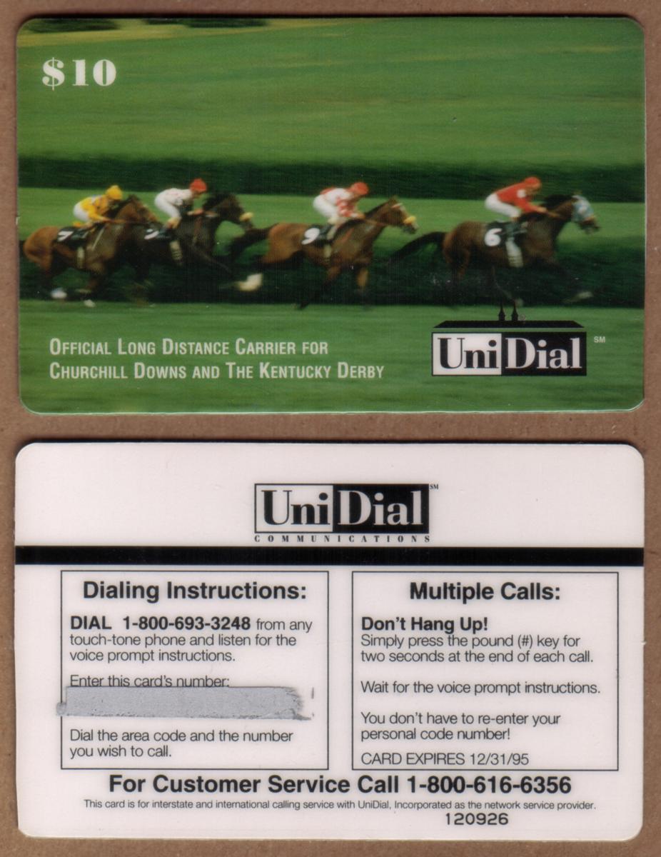 The phone card also incorporates branding from UniDial Communications, the official long-distance carrier for Churchill Downs and the Kentucky Derby, establishing the card’s official partnership and authenticity. The value of the card is $10, as indicated on the front, marking it as a collectible item linked to both horse racing and telecommunications.